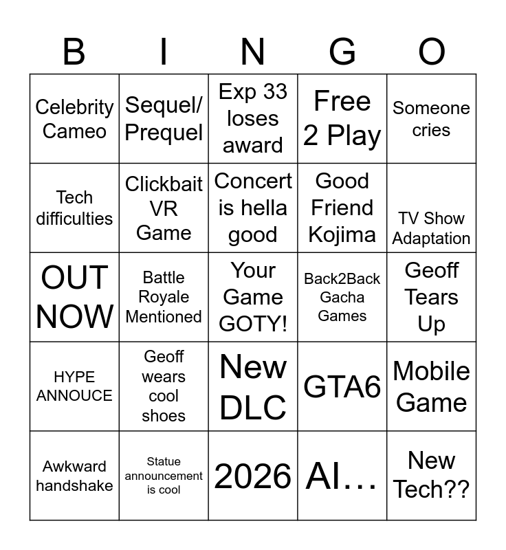 This bingo card has a free space and 24 words: Geoff wears cool shoes, Statue announcement is cool, Concert is hella good, Awkward handshake, Someone cries, Celebrity Cameo, Tech difficulties, Sequel/ Prequel, Back2Back Gacha Games, New DLC, Good Friend Kojima, OUT NOW, GTA6, Mobile Game, Clickbait VR Game, AI…, Geoff Tears Up, Exp 33 loses award, TV Show Adaptation, Battle Royale Mentioned, New Tech??, HYPE ANNOUCE, Free 2 Play and 2026.