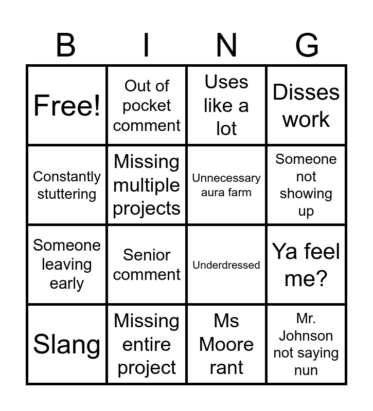 This bingo card has 16 words: Slang, Missing entire project, Uses like a lot, Disses work, Constantly stuttering, Out of pocket comment, Underdressed, Ya feel me?, Free!, Missing multiple projects, Ms Moore rant, Someone not showing up, Someone leaving early, Senior comment, Unnecessary aura farm and Mr. Johnson not saying nun.