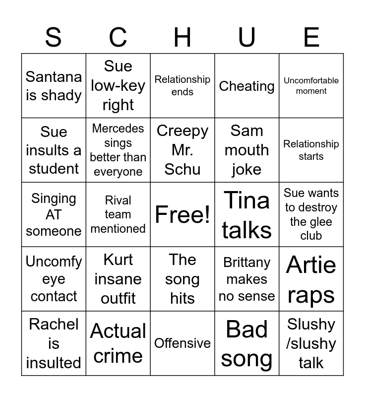 This bingo card has a free space and 25 words: Kurt insane outfit, Offensive, Creepy Mr. Schu, Rachel is insulted, Uncomfortable moment, Santana is shady, Sue insults a student, Sue low-key right, Tina talks, The song hits, Sam mouth joke, Singing AT someone, Brittany makes no sense, Artie raps, Mercedes sings better than everyone, Inappropriate song for minors to be singing, Sue wants to destroy the glee club, Relationship ends, Relationship starts, Rival team mentioned, Slushy /slushy talk, Actual crime, Uncomfy eye contact, Cheating and Bad song.