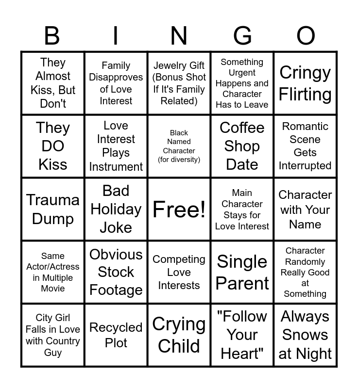 This bingo card has a free space and 24 words: Obvious Stock Footage, Recycled Plot, Black Named Character (for diversity), City Girl Falls in Love with Country Guy, Cringy Flirting, They Almost Kiss, But Don't, They DO Kiss, Family Disapproves of Love Interest, Main Character Stays for Love Interest, Competing Love Interests, Coffee Shop Date, Trauma Dump, Single Parent, Character Randomly Really Good at Something, Love Interest Plays Instrument, "Follow Your Heart", Character with Your Name, Jewelry Gift (Bonus Shot If It's Family Related), Romantic Scene Gets Interrupted, Bad Holiday Joke, Always Snows at Night, Same Actor/Actress in Multiple Movie, Something Urgent Happens and Character Has to Leave and Crying Child.