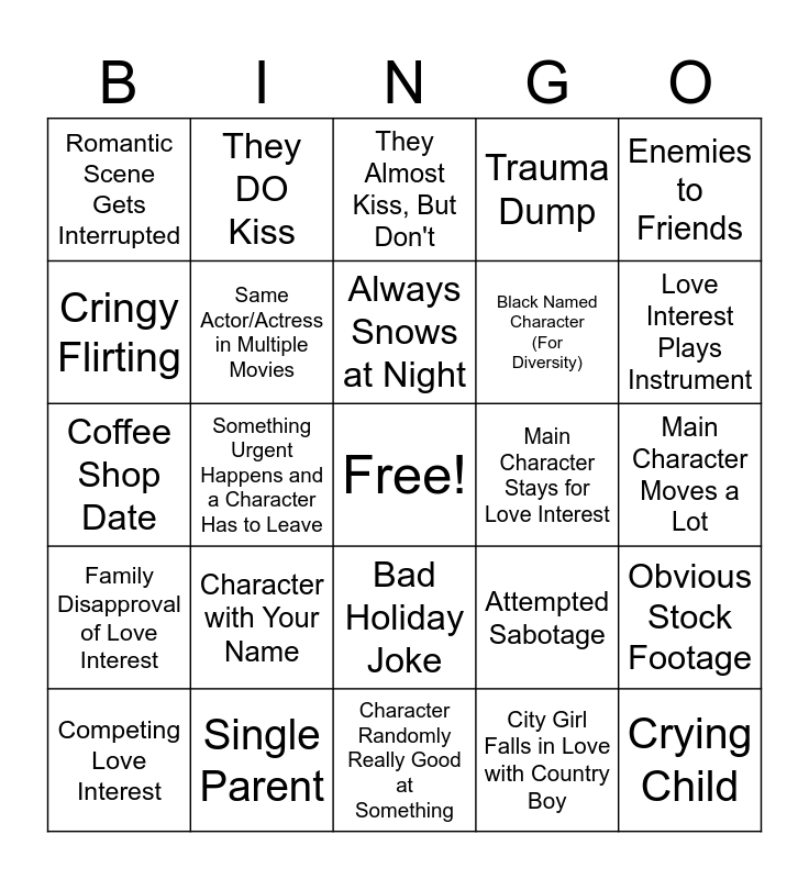 This bingo card has a free space and 28 words: Obvious Stock Footage, Recycled Plot, Black Named Character (For Diversity), City Girl Falls in Love with Country Boy, Cringy Flirting, They Almost Kiss, But Don't, They DO Kiss, Family Disapproval of Love Interest, Main Character Stays for Love Interest, Competing Love Interest, Coffee Shop Date, Trauma Dump, Single Parent, Character Randomly Really Good at Something, Love Interest Plays Instrument, "Follow Your Heart", Character with Your Name, Same Actor/Actress in Multiple Movies, Always Snows at Night, Bad Holiday Joke, Romantic Scene Gets Interrupted, Jewelry Gift (Bonus Shot if it's Family Related), Crying Child, Something Urgent Happens and a Character Has to Leave, Main Character Moves a Lot, Attempted Sabotage, Enemies to Friends and Someone has Died.