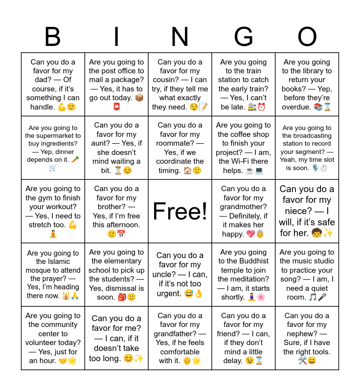 This bingo card has a free space and 30 words: Can you do a favor for me? โ I can, if it doesnโt take too long. ๐โจ, Can you do a favor for my sister? โ Sure, if she really needs it. ๐๐, Can you do a favor for my brother? โ Yes, if Iโm free this afternoon. ๐๐ , Can you do a favor for my mom? โ I will, if it helps her relax. ๐ผ๐, Can you do a favor for my dad? โ Of course, if itโs something I can handle. ๐ช๐, Can you do a favor for my cousin? โ I can try, if they tell me what exactly they need. ๐๐, Can you do a favor for my aunt? โ Yes, if she doesnโt mind waiting a bit. โณ๐, Can you do a favor for my uncle? โ I can, if itโs not too urgent. ๐ ๐, Can you do a favor for my grandmother? โ Definitely, if it makes her happy. ๐๐ต, Can you do a favor for my grandfather? โ Yes, if he feels comfortable with it. ๐ด๐, Can you do a favor for my niece? โ I will, if itโs safe for her. ๐งโจ, Can you do a favor for my nephew? โ Sure, if I have the right tools. ๐ ๏ธ๐, Can you do a favor for my friend? โ I can, if they donโt mind a little delay. ๐โ, Are you going to the botanical garden to sketch the flowers? โ Yes, just for a little while. ๐ฟ๐จ, Are you going to the broadcasting station to record your segment? โ Yeah, my time slot is soon. ๐๏ธโฑ๏ธ, Are you going to the Christian church to help with the service? โ Yes, I promised I would. โชโจ, Are you going to the Buddhist temple to join the meditation? โ I am, it starts shortly. ๐งโโ๏ธ๐ธ, Are you going to the Islamic mosque to attend the prayer? โ Yes, Iโm heading there now. ๐๐, Are you going to the elementary school to pick up the students? โ Yes, dismissal is soon. ๐๐, Are you going to the library to return your books? โ Yep, before theyโre overdue. ๐โ, Are you going to the gym to finish your workout? โ Yes, I need to stretch too. ๐ช๐ง, Are you going to the airport to meet your friend? โ Yeah, their flight lands soon. โ๏ธ๐ค, Are you going to the post office to mail a package? โ Yes, it has to go out today. ๐ฆ๐ฎ, Are you going to the coffee shop to finish your project? โ I am, the Wi-Fi there helps. โ๐ป, Are you going to the supermarket to buy ingredients? โ Yep, dinner depends on it. ๐ฅ๐, Are you going to the train station to catch the early train? โ Yes, I canโt be late. ๐โฐ, Are you going to the music studio to practice your song? โ I am, I need a quiet room. ๐ต๐ค, Are you going to the community center to volunteer today? โ Yes, just for an hour. ๐ค๐, Can you do a favor for my roommate? โ Yes, if we coordinate the timing. ๐ ๐ and Can you do a favor for my teacher? โ I will, if itโs allowed. ๐๐.