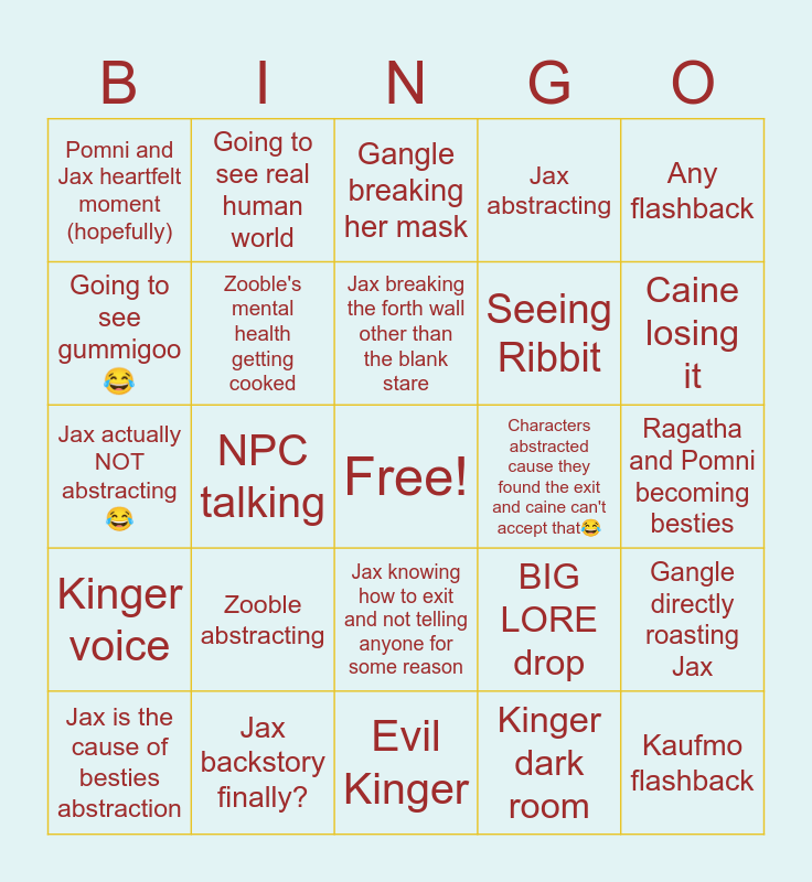 This bingo card has a free space and 24 words: Zooble abstracting, Jax backstory finally?, Jax breaking the forth wall other than the blank stare, Jax is the cause of besties abstraction, Any flashback, Pomni and Jax heartfelt moment (hopefully), Going to see gummigoo😂, Going to see real human world, Characters abstracted cause they found the exit and caine can't accept that😂, Jax knowing how to exit and not telling anyone for some reason, Seeing Ribbit, Jax actually NOT abstracting😂, BIG LORE drop, Gangle directly roasting Jax, Zooble's mental health getting cooked, Kinger dark room, Ragatha and Pomni becoming besties, Gangle breaking her mask, Caine losing it, NPC talking, Kaufmo flashback, Kinger voice, Jax abstracting and Evil Kinger.