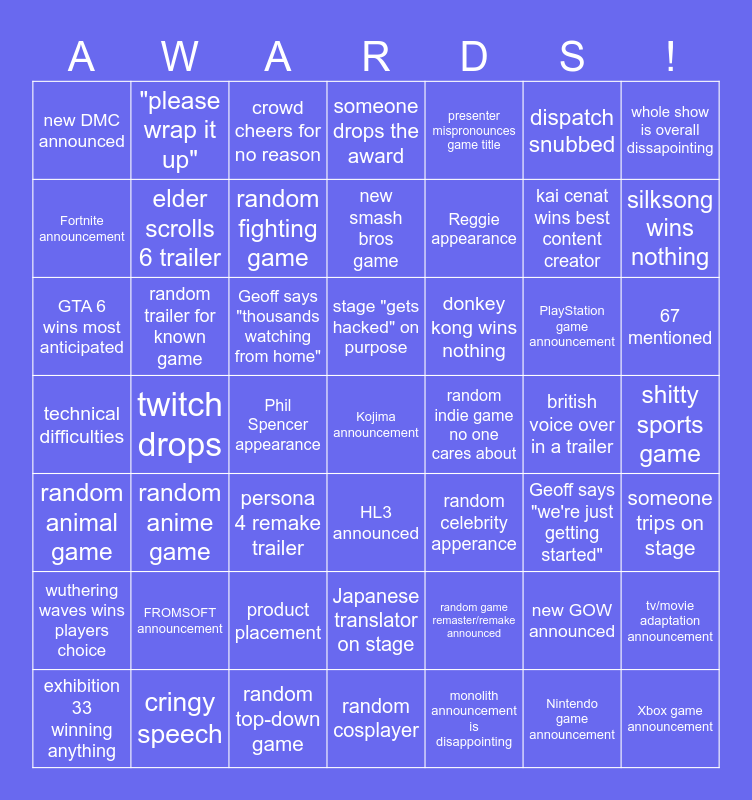 This bingo card has 49 words: new GOW announced, kai cenat wins best content creator, monolith announcement is disappointing, twitch drops, Geoff says "thousands watching from home", shitty sports game, "please wrap it up", random top-down game, dispatch snubbed, HL3 announced, whole show is overall dissapointing, someone drops the award, PlayStation game announcement, donkey kong wins nothing, FROMSOFT announcement, british voice over in a trailer, Fortnite announcement, silksong wins nothing, tv/movie adaptation announcement, presenter mispronounces game title, Reggie appearance, Phil Spencer appearance, new DMC announced, elder scrolls 6 trailer, exhibition 33 winning anything, random fighting game, 67 mentioned, cringy speech, stage "gets hacked" on purpose, random trailer for known game, Xbox game announcement, random indie game no one cares about, wuthering waves wins players choice, product placement, technical difficulties, random celebrity apperance, Geoff says "we're just getting started", someone trips on stage, GTA 6 wins most anticipated, persona 4 remake trailer, Japanese translator on stage, random animal game, Kojima announcement, random cosplayer, new smash bros game, crowd cheers for no reason, random game remaster/remake announced, random anime game and Nintendo game announcement.