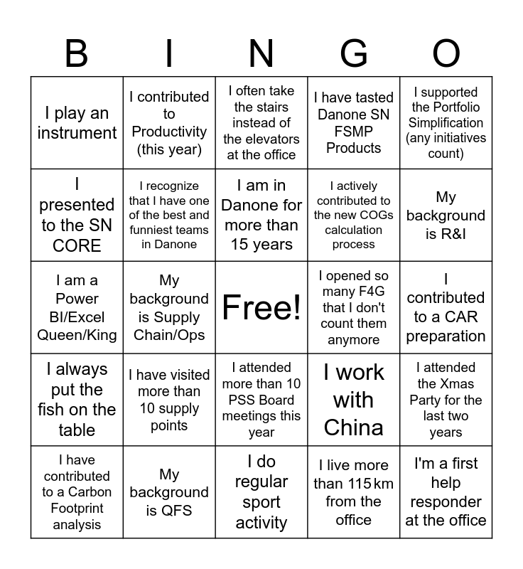 This bingo card has a free space and 24 words: I have visited more than 10 supply points, My background is QFS, I am in Danone for more than 15 years, I have contributed to a Carbon Footprint analysis, I supported the Portfolio Simplification (any initiatives count), I play an instrument, I presented to the SN CORE, I contributed to Productivity (this year), I opened so many F4G that I don't count them anymore, I attended more than 10 PSS Board meetings this year, I actively contributed to the new COGs calculation process, I am a Power BI/Excel Queen/King, I work with China, I attended the Xmas Party for the last two years, I recognize that I have one of the best and funniest teams in Danone, I live more than 115 km from the office, I contributed to a CAR preparation, I often take the stairs instead of the elevators at the office, My background is R&I, My background is Supply Chain/Ops, I'm a first help responder at the office, I always put the fish on the table, I have tasted Danone SN FSMP Products and I do regular sport activity.