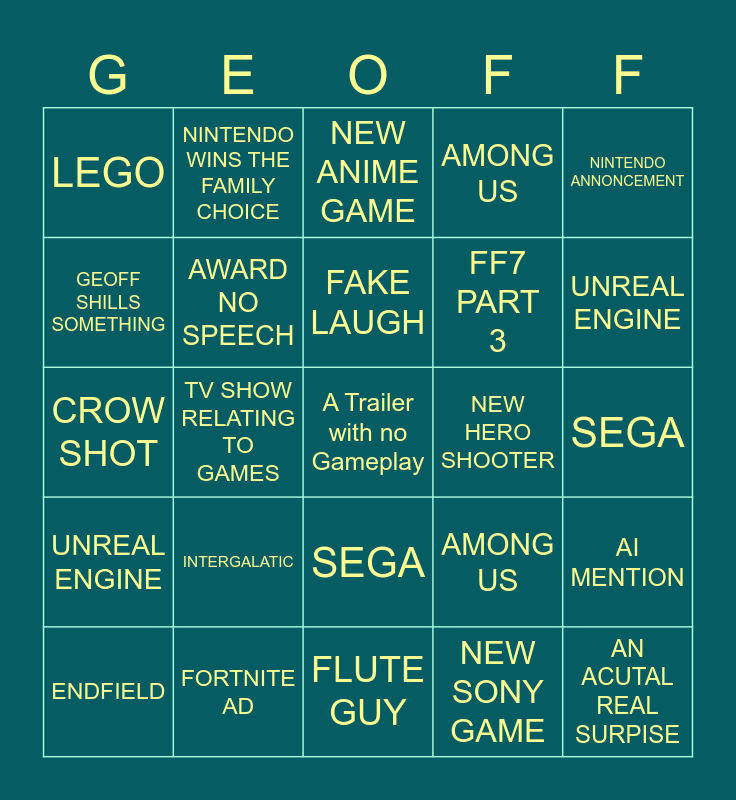 ⚠ This card has duplicate items: TRAILER W/ NO GAMEPLAY (2), RANDOM CELEB (2), NEW ANIME GAME (2), UMA WINS BEST MOBILE GAME (2), [YOUR PLAYERS VOICE HERE] (2), NINTENDO WINS THE FAMILY CHOICE (2), GTA 6 MENTION (2), HALF LIFE 3 (2), kojima. (2), NEW SOULSLIKE (2), AI MENTION (2), TV SHOW RELATING TO GAMES (2), AMONG US (2), LEGO (2), RANDOM SPEECH ABOUT HOW IMPORTANT OR COOL GAMING IS (2), GEOFF SHILLS SOMETHING (2), DLC ANNONCEMENT (2), INTERGALATIC (2), LAYOFFS (2), SEGA (2), FF7 PART 3 (2), NINTENDO ANNONCEMENT (2), FAKE LAUGH (2), AWARD NO SPEECH (2), MISPRONOUCATION (2), VIDEO CALL (2), JOSEF FARES (2), MARVEL MENTION (2), A NEW REMAKE (2), UNREAL ENGINE (2), FORTNITE AD (2), FLUTE GUY (2), HOYOVERSE (2), ENDFIELD (2), NEW HERO SHOOTER (2), NEW SONY GAME (2), MONSTER HUNTER (2), NEW ROGUELIKE (2), AN ACUTAL REAL SURPISE (2)
