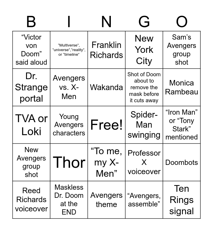 This bingo card has a free space and 24 words: Reed Richards voiceover, Thor, Wakanda, “Avengers, assemble”, Sam’s Avengers group shot, “Victor von Doom” said aloud, “Multiverse”, “universe”,“reality”, or “timeline”, Franklin Richards, Spider-Man swinging, “Iron Man” or “Tony Stark” mentioned, TVA or Loki, Avengers vs. X-Men, Professor X voiceover, Doombots, Dr. Strange portal, Maskless Dr. Doom at the END, Avengers theme, New York City, Monica Rambeau, New Avengers group shot, Young Avengers characters, “To me, my X-Men”, Shot of Doom about to remove the mask before it cuts away and Ten Rings signal.