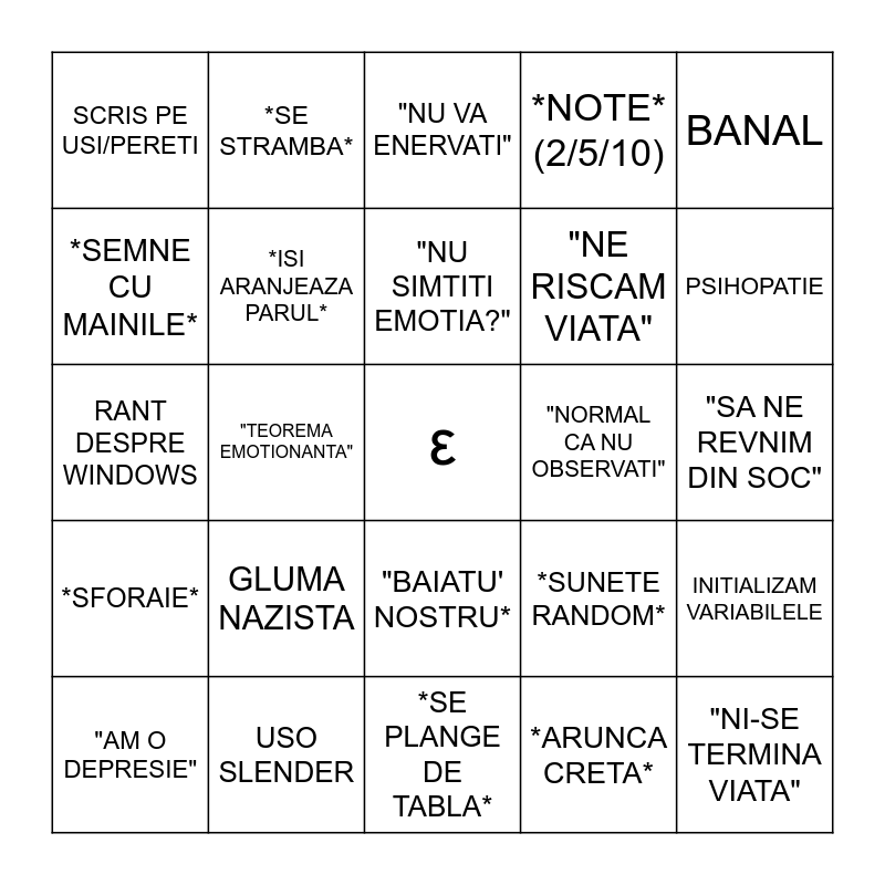 This bingo card has a free space and 24 words: GLUMA NAZISTA, USO SLENDER, "NU SIMTITI EMOTIA?", "AM O DEPRESIE", BANAL, SCRIS PE USI/PERETI, *SEMNE CU MAINILE*, *SE STRAMBA*, "NORMAL CA NU OBSERVATI", "BAIATU' NOSTRU*, "NE RISCAM VIATA", RANT DESPRE WINDOWS, *SUNETE RANDOM*, INITIALIZAM VARIABILELE, *ISI ARANJEAZA PARUL*, *ARUNCA CRETA*, "SA NE REVNIM DIN SOC", "NU VA ENERVATI", PSIHOPATIE, "TEOREMA EMOTIONANTA", "NI-SE TERMINA VIATA", *SFORAIE*, *NOTE* (2/5/10) and *SE PLANGE DE TABLA*.