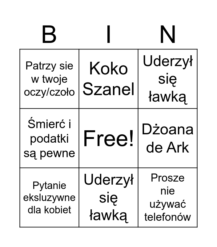 This bingo card has a free space and 9 words: Pytanie eksluzywne dla kobiet, Uderzył się ławką, Koko Szanel, Śmierć i podatki są pewne, Patrzy sie w twoje oczy/czoło, Dżoana de Ark, Prosze nie używać telefonów, Kobiety na uniwersytetach and Uderzył się ławką.