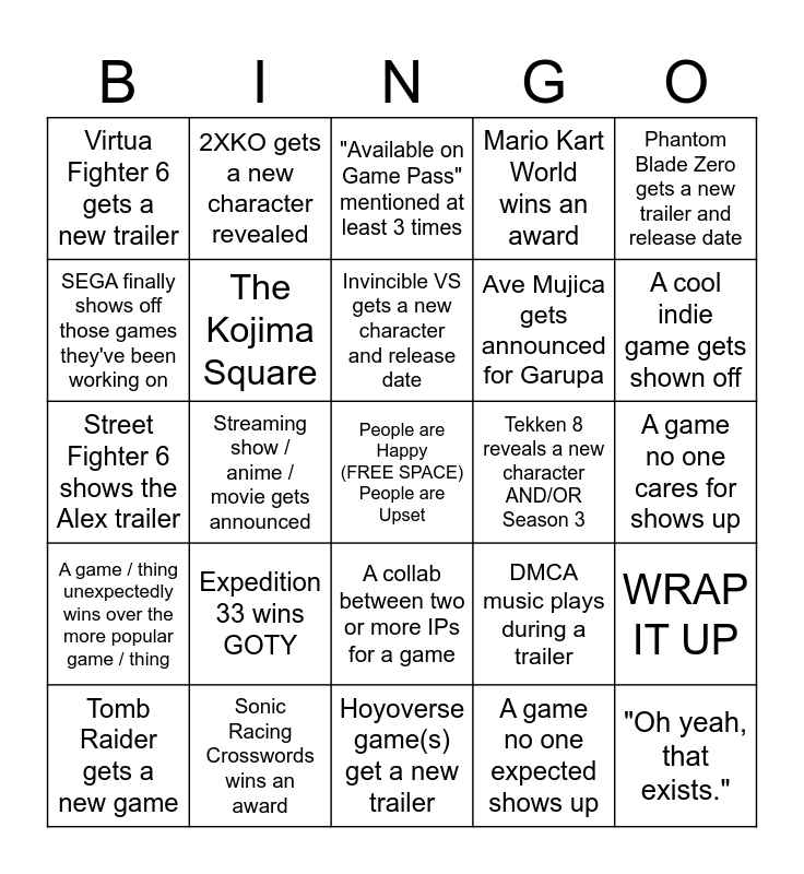 This bingo card has a free space and 24 words: Expedition 33 wins GOTY, Sonic Racing Crosswords wins an award, Invincible VS gets a new character and release date, Tomb Raider gets a new game, Phantom Blade Zero gets a new trailer and release date, Virtua Fighter 6 gets a new trailer, SEGA finally shows off those games they've been working on, 2XKO gets a new character revealed, Tekken 8 reveals a new character AND/OR Season 3, A collab between two or more IPs for a game, Ave Mujica gets announced for Garupa, Street Fighter 6 shows the Alex trailer, DMCA music plays during a trailer, WRAP IT UP, The Kojima Square, A game no one expected shows up, A game no one cares for shows up, "Available on Game Pass" mentioned at least 3 times, A cool indie game gets shown off, Streaming show / anime / movie gets announced, "Oh yeah, that exists.", A game / thing unexpectedly wins over the more popular game / thing, Mario Kart World wins an award and Hoyoverse game(s) get a new trailer.