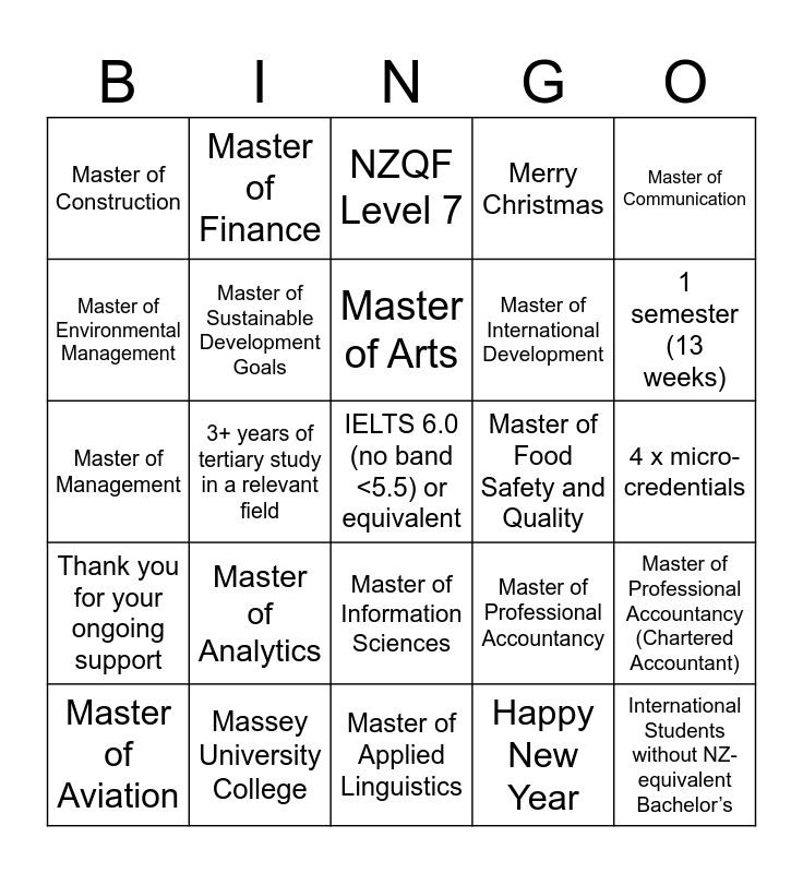 This bingo card has 25 words: Master of Analytics, Master of Applied Linguistics, Master of Arts, Master of Aviation, Master of Communication, Master of Construction, Master of Environmental Management, Master of Finance, Master of Food Safety and Quality, Master of Information Sciences, Master of International Development, Master of Management, Master of Professional Accountancy, Master of Professional Accountancy (Chartered Accountant), Master of Sustainable Development Goals, International Students without NZ-equivalent Bachelor’s, 4 x micro-credentials, NZQF Level 7, 1 semester (13 weeks), 3+ years of tertiary study in a relevant field, IELTS 6.0 (no band <5.5) or equivalent, Massey University College, Thank you for your ongoing support, Merry Christmas and Happy New Year.