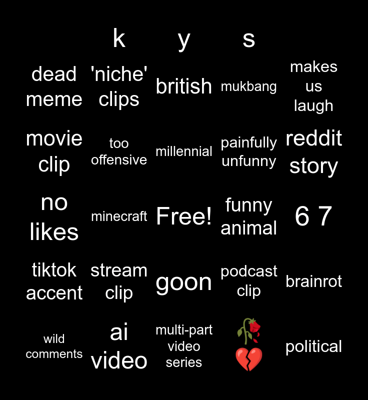 This bingo card has a free space and 24 words: stream clip, ai video, millennial, wild comments, makes us laugh, dead meme, movie clip, 'niche' clips, funny animal, goon, painfully unfunny, no likes, podcast clip, brainrot, too offensive, 🥀💔, 6 7, british, reddit story, minecraft, political, tiktok accent, mukbang and multi-part video series.