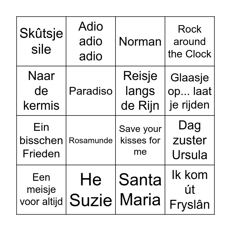 This bingo card has 35 words: Feliz Navidad, Ik lig op m'n kussen stil te dromen, Mooi was die tijd, Reisje langs de Rijn, Noël, Rock around the Clock, Paradiso, Spring maar achterop, Glaasje op... laat je rijden, Blueberry Hill, Save your kisses for me, Naar de kermis, Dancing Queen, Leo, Skûtsje sile, He Suzie, White Christmas, Dag zuster Ursula, Ik kom út Fryslân, Een meisje voor altijd, Let it Be, Us pake syn klok, Frysk hynder, De herdertjes lagen bij nachte, Norman, Rosamunde, Viva Espana, Immer wieder Sonntags, Ein bisschen Frieden, Santa Maria, Happy New Year, Sleigh Ride, Sjakie van der Hoek, Adio adio adio and Tulpen uit Amsterdam.