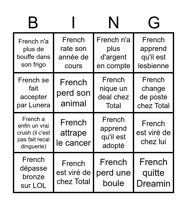 This bingo card has 16 words: French est viré de chez Total, French est viré de chez lui, French n'a plus d'argent en compte, French n'a plus de bouffe dans son frigo, French a enfin un vrai crush (il c'est pas fait recal dinguerie), French rate son année de cours, French apprend qu'il est adopté, French perd une boule, French se fait accepter par Lunera, French perd son animal, French dépasse bronze sur LOL, French apprend qu'il est lesbienne, French attrape le cancer, French change de poste chez Total, French nique un deal chez Total and French quitte Dreamin.