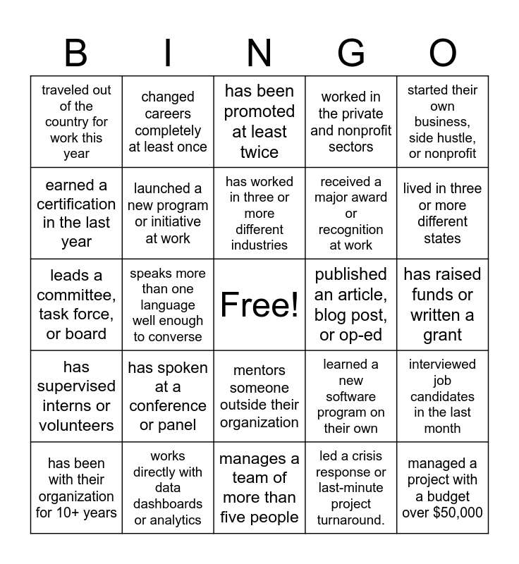 This bingo card has a free space and 25 words: has spoken at a conference or panel, manages a team of more than five people, has worked in three or more different industries, has been with their organization for 10+ years, started their own business, side hustle, or nonprofit, traveled out of the country for work this year, earned a certification in the last year, changed careers completely at least once, published an article, blog post, or op-ed, mentors someone outside their organization, received a major award or recognition at work, leads a committee, task force, or board, learned a new software program on their own, interviewed job candidates in the last month, launched a new program or initiative at work, taught a workshop or training session, has raised funds or written a grant, has been promoted at least twice, lived in three or more different states, speaks more than one language well enough to converse, managed a project with a budget over $50,000, works directly with data dashboards or analytics, has supervised interns or volunteers, worked in the private and nonprofit sectors and led a crisis response or last-minute project turnaround..