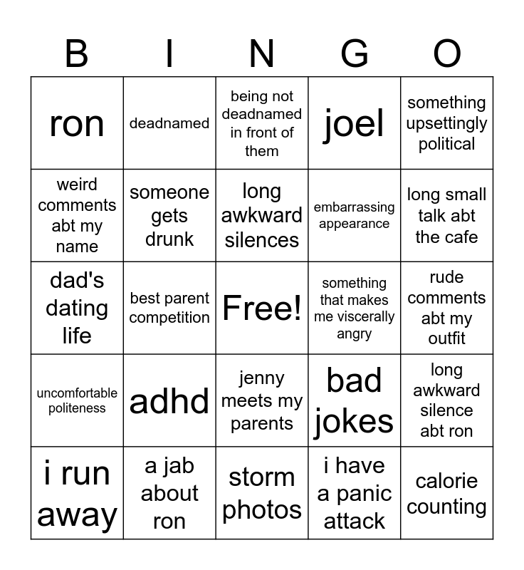 This bingo card has a free space and 24 words: adhd, a jab about ron, long awkward silences, i run away, something upsettingly political, ron, weird comments abt my name, deadnamed, something that makes me viscerally angry, jenny meets my parents, embarrassing appearance, dad's dating life, bad jokes, long awkward silence abt ron, someone gets drunk, i have a panic attack, rude comments abt my outfit, being not deadnamed in front of them, long small talk abt the cafe, best parent competition, calorie counting, uncomfortable politeness, joel and storm photos.