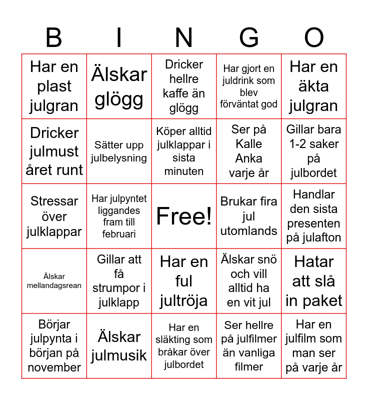 This bingo card has a free space and 24 words: Gillar att få strumpor i julklapp, Älskar julmusik, Köper alltid julklappar i sista minuten, Börjar julpynta i början på november, Har en äkta julgran, Har en plast julgran, Dricker julmust året runt, Älskar glögg, Brukar fira jul utomlands, Har en ful jultröja, Ser på Kalle Anka varje år, Stressar över julklappar, Älskar snö och vill alltid ha en vit jul, Hatar att slå in paket, Sätter upp julbelysning, Ser hellre på julfilmer än vanliga filmer, Handlar den sista presenten på julafton, Dricker hellre kaffe än glögg, Gillar bara 1-2 saker på julbordet, Har julpyntet liggandes fram till februari, Har en julfilm som man ser på varje år, Älskar mellandagsrean, Har gjort en juldrink som blev förväntat god and Har en släkting som bråkar över julbordet.