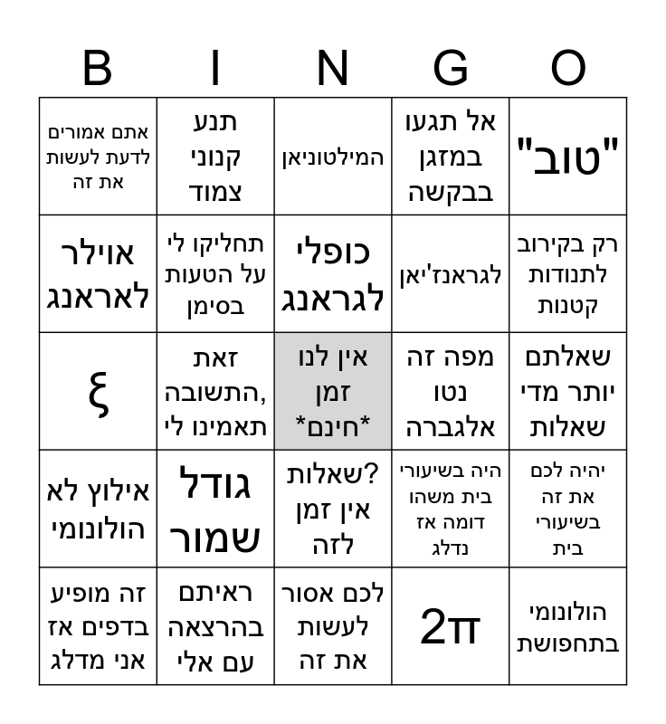 This bingo card has a free space and 29 words: זה מופיע בדפים אז אני מדלג, תנו לי לסיים רגע, זאת התשובה, תאמינו לי, רק עוד שתי מילים על הפתרון, אתם אמורים לדעת לעשות את זה, המילטוניאן, תחליקו לי על הטעות בסימן, גודל שמור, מפה זה נטו אלגברה, ראיתם בהרצאה עם אלי, שאלתם יותר מדי שאלות, הולונומי בתחפושת, לכם אסור לעשות את זה, 2π, רק בקירוב לתנודות קטנות, אם נספיק את השאלה האחרונה, שאלות? אין זמן לזה, אילוץ לא הולונומי, "טוב", ξ, היה בשיעורי בית משהו דומה אז נדלג, נשתמש בסימטריה, לגראנז'יאן, אוילר לאראנג, אל תגעו במזגן בבקשה, תנע קנוני צמוד, יהיה לכם את זה בשיעורי בית, כופלי לגראנג and רואים מייד.