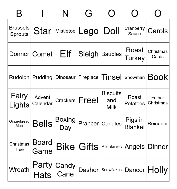 This bingo card has a free space and 48 words: Stockings, Roast Turkey, Dasher, Advent Calendar, Dinosaur, Father Christmas, Star, Party Hats, Cranberry Sauce, Prancer, Carols, Lego, Snowman, Tinsel, Christmas Tree, Roast Potatoes, Donner, Christmas Cards, Angels, Doll, Baubles, Crackers, Brussels Sprouts, Comet, Dinner, Elf, Book, Wreath, Fireplace, Pudding, Dancer, Biscuits and Milk, Reindeer, Board Game, Fairy Lights, Candles, Pigs in Blanket, Rudolph, Boxing Day, Bike, Gingerbread Man, Holly, Mistletoe, Candy Cane, Sleigh, Gifts, Bells and Snowflakes.
