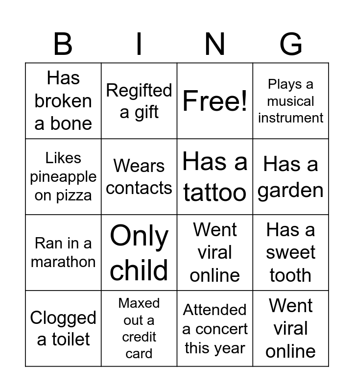 This bingo card has 19 words: Went viral online, Has a sweet tooth, Free!, Went viral online, Has a sweet tooth, Likes pineapple on pizza, Attended a concert this year, Has broken a bone, Regifted a gift, Ran in a marathon, Only child, Wears contacts, Has a tattoo, Maxed out a credit card, Clogged a toilet, Left-handed, Plays a musical instrument, Has a garden and Screams during scary movies.