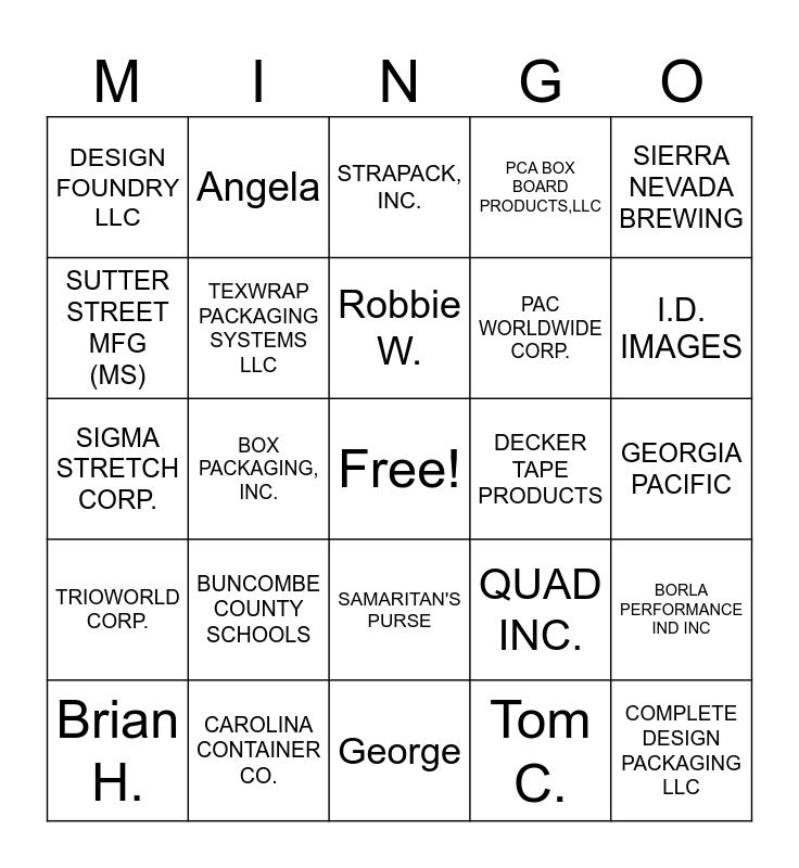 This bingo card has a free space and 122 words: Tony, Josh, Jessica, Michael, Brian, Hannah, Angela, Anthony, George, Jackie, Danny, Vicki, Ty, Jamie, Tee, Pete, Brian H., Bill M., John M., Harrison, Tom C., Robbie W., Don, RandallALLIANCE PLASTICS, MORRISETTE CUSTOM SERVICES, PCA BOX BOARD PRODUCTS,LLC, CAROLINA CONTAINER CO., INTERTAPE POLYMER CORP., RANPAK CORP., PREGIS CORP., MORRISETTE FOAM, SIGMA STRETCH CORP., TRIOWORLD CORP., CMC AMERICA LLC, RUSKEN PACKAGING SPARTANBURG, CONCEPT PACKAGING GROUP, GEORGIA PACIFIC, CT COMMERCIAL PAPER LLC, UNIVERSAL PACKAGING, JBB PACKAGING LLC, GP CORRUGATED LLC, LANTECH.COM, LLC, TREE BRAND PACKAGING INC, QUALITY PACKAGING CORP., BADGER PAPERBOARD NC,LLC, HENRY MOLDED PRODUCTS, 3M GLOBAL CHANNEL SERVICES, HOOD CONTAINER CORPORATION, REPUBLIC BAG COMPANY, BOX PACKAGING, INC., ZHONGCHENG PACKAGING USA, PAC WORLDWIDE CORP., MORRISETTE PAPER COMPANY, MCLEAN PACKAGING CORP, T M POLY FILM INC., LADDAWN MANUFACTURING, 3M COMPANY, CHARTER NEXT GENERATION INC, LAGASSE BROS, INC., I.D. IMAGES, COMPLETE DESIGN PACKAGING LLC, SIGNODE PACKAGING, ECO FIBER PACKAGING, EPSILON PLASTICS INC, CLASSIC PACKAGING, TEXWRAP PACKAGING SYSTEMS LLC, AIR PROTECTION PACKAGING CORP, GEORGIA PACIFIC, MORRISETTE PAPER COMPANY, INC., QUAD INC., DECKER TAPE PRODUCTS, STRAPACK, INC., OPUS PACKAGING GROUP, INC.AEROFLOW INC, ETHAN ALLEN OPERATIONS INC, VLR LLC, CENTURY FURNITURE *SLS#78*, DESIGN FOUNDRY LLC, QEP COMPANY INC, TENOWO INC, POPPY HANDCRAFTED POPCORN INC, TAGEOS INC, BORLA PERFORMANCE IND INC, SUTTER STREET MFG (MS), MAYO MANUFACTURING CORP, SOUTH FORK INDUSTRIES INC, HICKORY CHAIR COMPANY, MERITOR HEAVY VEHICLE *#53*, THE MANUAL WOODWORKER-NC, FMS ENTERPRISES USA INC, ASHEVILLE KOMBUCHA MAMAS LLC, PRC INDUSTRIES INC, THE QUARTZ CORP USA, BRP US INC, SUTTER STREET MFG - NC, ROLLEASE, RESTORATION HARDWARE INC, SAMOA CORPORATION, SEIREN NORTH AMERICA LLC, VISTA HORTICULTURE GROUP INC, SAMARITAN'S PURSE, ZRO DELTA, NAPCO INC, VIKING TACTICS INC, ECOLAB/NATIONAL WIPER *JE*, TB ARHAUS LLC, SIERRA NEVADA BREWING, CLARK CONTAINER INC, DODGE INDUSTRIAL, HUBBELL DISTRIBUTION INC, KLEEN-TECH INC (NC), VALLEN DIST - CORNING OPTICAL, TSG FINISHING LLC, MANNA FOODBANK, NEPTCO INC / CHASE N. AMERICA, BUNCOMBE COUNTY SCHOOLS, ADVANCEPIERRE FOODS SMN39, NEW EXCELSIOR OF SIGMA PLASTIC, THE NORTHWEST GROUP LLC, DARE VEGAN CHEESE LLC, CUSTOM PAK INC (NC LOC), LEGALLY ADDICTIVE FOODS LLC and DIGITAL CUTTING SERVICES INC.