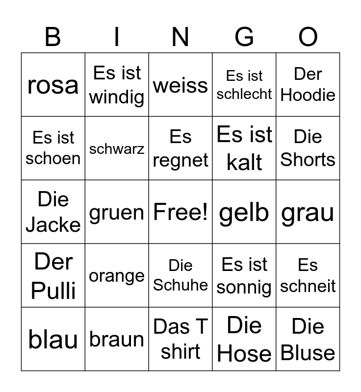 This bingo card has a free space and 29 words: blau, rot, gruen, lila, rosa, weiss, schwarz, orange, gelb, braun, grau, Die Bluse, Das T shirt, Die Hose, Die Shorts, Die Socken, Die Schuhe, Der Pulli, Der Hoodie, Die Jacke, Es ist sonnig, Es ist heiss, Es ist kalt, Es ist schoen, Es ist schlecht, Es ist windig, Es schneit, Es regnet and Es ist wolkig.