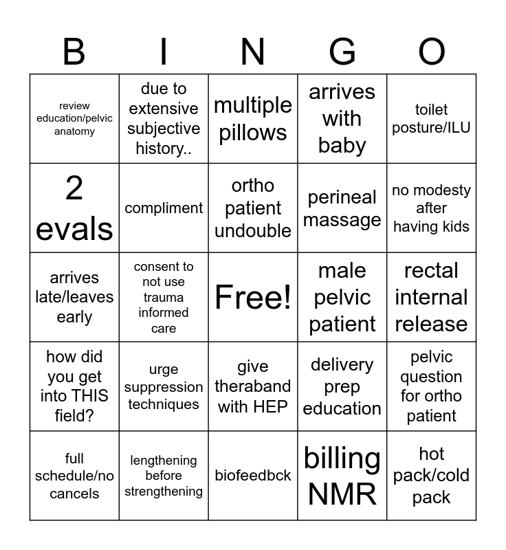 This bingo card has a free space and 24 words: urge suppression techniques, lengthening before strengthening, ortho patient undouble, full schedule/no cancels, toilet posture/ILU, review education/pelvic anatomy, 2 evals, due to extensive subjective history.., male pelvic patient, give theraband with HEP, perineal massage, arrives late/leaves early, delivery prep education, pelvic question for ortho patient, compliment, billing NMR, rectal internal release, multiple pillows, no modesty after having kids, consent to not use trauma informed care, hot pack/cold pack, how did you get into THIS field?, arrives with baby and biofeedbck.