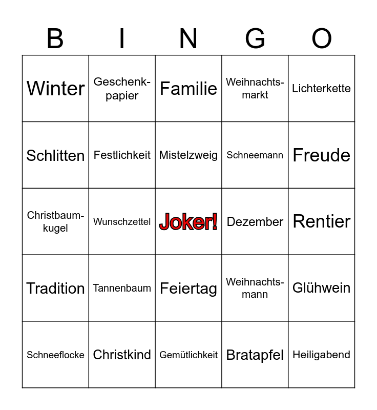 This bingo card has a free space and 24 words: Tannenbaum, Christkind, Mistelzweig, Schneeflocke, Lichterkette, Winter, Schlitten, Geschenk-papier, Dezember, Feiertag, Schneemann, Christbaum-kugel, Weihnachts- mann, Glühwein, Festlichkeit, Bratapfel, Rentier, Familie, Freude, Wunschzettel, Heiligabend, Tradition, Weihnachts-markt and Gemütlichkeit.