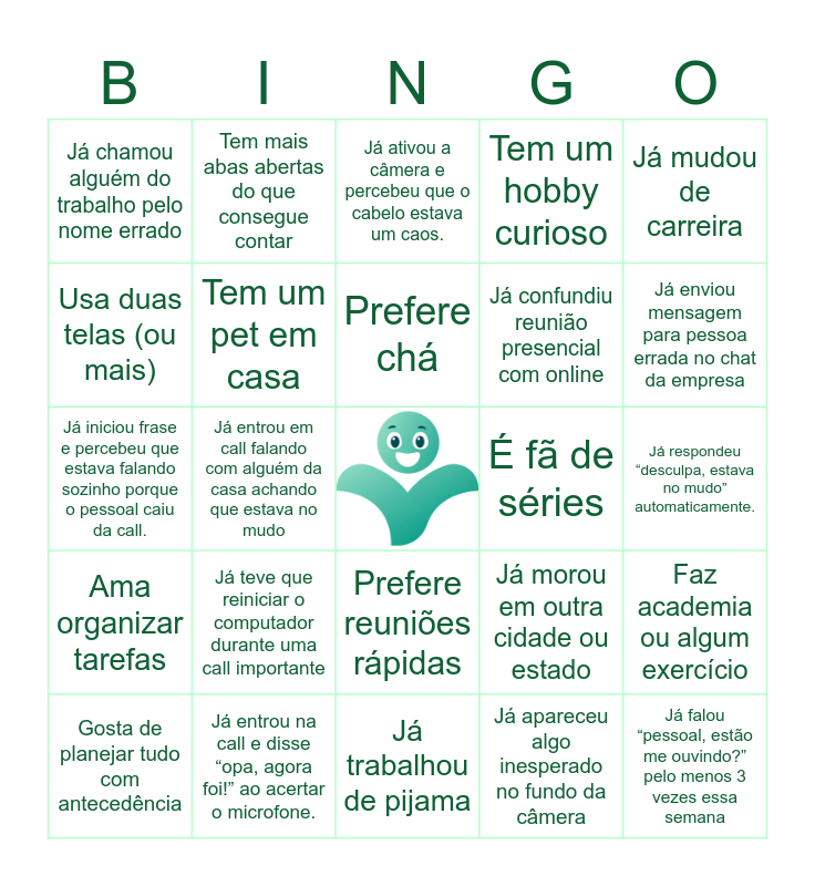 This bingo card has a free space and 46 words: Já participou de reunião com o microfone no mudo, Já falou “pessoal, estão me ouvindo?” pelo menos 3 vezes essa semana, Entrou em reunião enquanto buscava café, Já trabalhou de pijama, Já teve que reiniciar o computador durante uma call importante, Já teve problema de internet no meio da reunião, Tem mais abas abertas do que consegue contar, Já esqueceu de clicar em “Compartilhar tela”, Usa duas telas (ou mais), Chegou atrasado porque estava em outra call, Tem um pet em casa, Tem um hobby curioso, Faz academia ou algum exercício, Já morou em outra cidade ou estado, Gosta de cozinhar, Ama café, Prefere chá, É fã de séries, Tem talento oculto, Já mudou de carreira, Já entrou em call falando com alguém da casa achando que estava no mudo, Já apareceu algo inesperado no fundo da câmera, Já chamou alguém do trabalho pelo nome errado, Já confundiu reunião presencial com online, Já esqueceu a câmera ligada sem perceber, Já enviou mensagem para pessoa errada no chat da empresa, Gosta de planejar tudo com antecedência, Se considera multitarefa, Prefere reuniões rápidas, Ama organizar tarefas, É a pessoa que lembra dos aniversários, Já salvou alguém do time com uma informação crucial, É mais produtivo de manhã, É mais produtivo à noite, Já trabalhou em startup antes, Já entrou na call e disse “opa, agora foi!” ao acertar o microfone., Já respondeu “desculpa, estava no mudo” automaticamente., Já disse “vocês estão vendo minha tela?” mesmo sabendo que não estava compartilhando., Já entrou no link errado de reunião., Já entrou em reunião que “poderia ter sido um e-mail”., Já fingiu que entendeu algo na reunião e depois foi perguntar para alguém offline., Já ativou a câmera e percebeu que o cabelo estava um caos., Já iniciou frase e percebeu que estava falando sozinho porque o pessoal caiu da call., Já teve que explicar para alguém como entrar no Zoom/Meet., Já fez call do carro. and Já fez call andando pela casa procurando sinal..