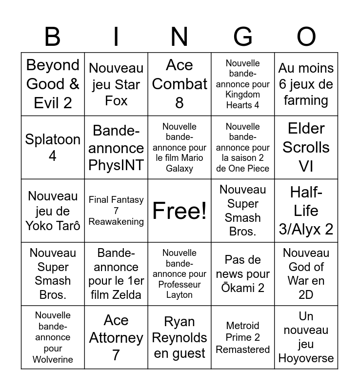 This bingo card has a free space and 24 words: Bande-annonce pour le 1er film Zelda, Ace Attorney 7, Nouvelle bande-annonce pour le film Mario Galaxy, Nouvelle bande-annonce pour Wolverine, Au moins 6 jeux de farming, Beyond Good & Evil 2, Splatoon 4, Nouveau jeu Star Fox, Nouveau Super Smash Bros., Nouvelle bande-annonce pour Professeur Layton, Nouvelle bande-annonce pour la saison 2 de One Piece, Nouveau jeu de Yoko Tarô, Pas de news pour Ōkami 2, Nouveau God of War en 2D, Bande-annonce PhysINT, Metroid Prime 2 Remastered, Half-Life 3/Alyx 2, Ace Combat 8, Elder Scrolls VI, Final Fantasy 7 Reawakening, Un nouveau jeu Hoyoverse, Nouveau Super Smash Bros., Nouvelle bande-annonce pour Kingdom Hearts 4 and Ryan Reynolds en guest.