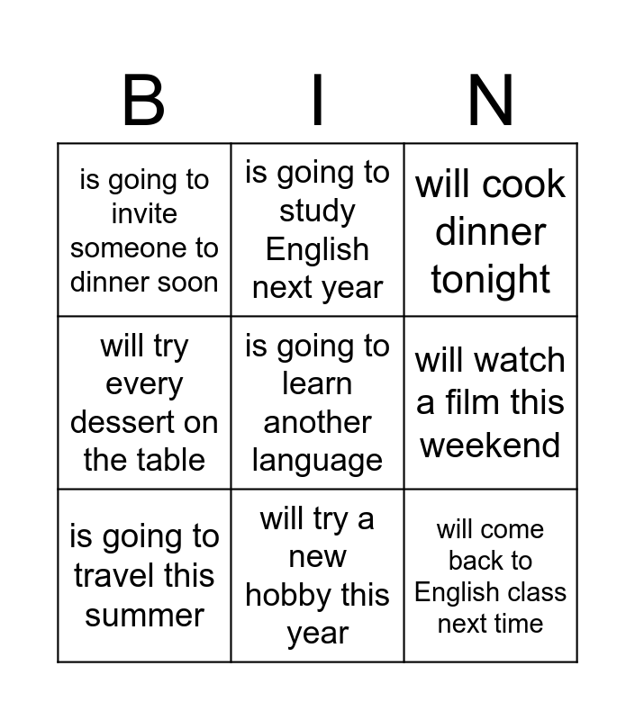 This bingo card has 9 words: is going to travel this summer, will cook dinner tonight, is going to study English next year, will try every dessert on the table, is going to invite someone to dinner soon, will watch a film this weekend, is going to learn another language, will come back to English class next time and will try a new hobby this year.