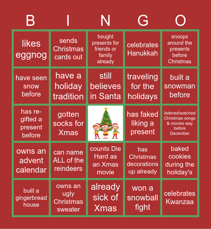 This bingo card has a free space and 24 words: can name ALL of the reindeers, owns an ugly Christmas sweater, still believes in Santa, built a gingerbread house, snoops around the presents before Christmas, likes eggnog, have seen snow before, sends Christmas cards out, has faked liking a present, counts Die Hard as an Xmas movie, traveling for the holidays, has re-gifted a present before, has Christmas decorations up already, baked cookies during the holiday's, have a holiday tradition, won a snowball fight, listened/watched Christmas songs & movies way before December, bought presents for friends or family already, built a snowman before, gotten socks for Xmas, celebrates Kwanzaa, owns an advent calendar, celebrates Hanukkah and already sick of Xmas.