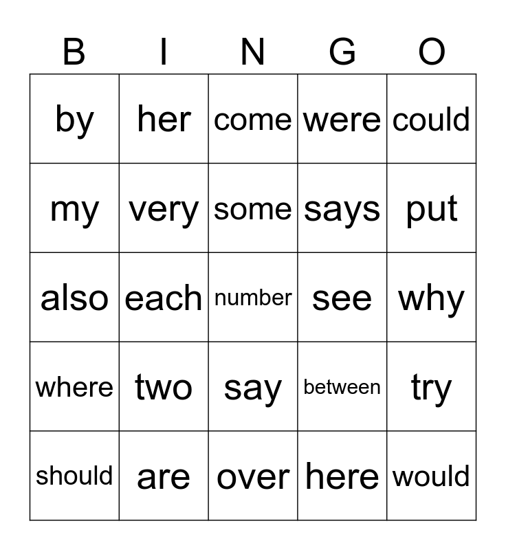This bingo card has 25 words: two, over, some, should, could, by, my, her, see, say, says, also, between, try, very, would, why, come, put, each, number, are, where, were and here.