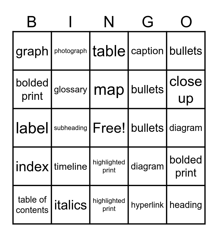 This bingo card has a free space and 27 words: diagram, glossary, bullets, highlighted print, bolded print, table, photograph, index, bullets, bolded print, label, caption, table of contents, italics, close up, illustration, glossary, map, timeline, graph, diagram, hyperlink, subheading, heading, highlighted print, bullets and chart.