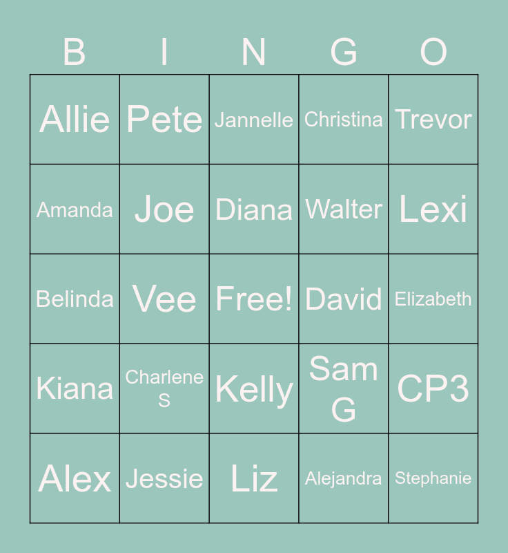 This bingo card has a free space and 35 words: Shayna, Anissa, Ashley, Joe, Kelly, Christina, Amanda, Carl, Diana, Emily, Belinda, Trevor, Seth, Sharisse, Allie, David, Alejandra, Vee, Kiana, Stephanie, Sam G, Alex, CP3, Jessie, Jannelle, Lexi, Hannah, Attalah, Walter, Elizabeth, Michelle, Liz, Charlene S, Pete and Kacey.