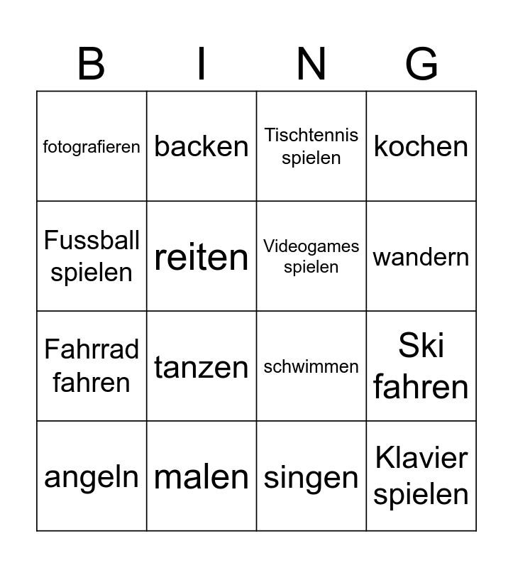 This bingo card has 16 words: malen, Ski fahren, Tischtennis spielen, fotografieren, Fahrrad fahren, backen, schwimmen, singen, Fussball spielen, reiten, angeln, kochen, tanzen, wandern, Videogames spielen and Klavier spielen.