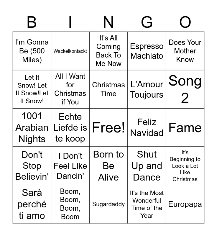 This bingo card has a free space and 40 words: 100%, 1001 Arabian Nights, 9 to 5, All I Want for Christmas if You, Boom, Boom, Boom, Boom, Born to Be Alive, Christmas Time, Do They Know It's Christmas, Does Your Mother Know, Don't Stop Believin', Echte Liefde is te koop, Espresso Machiato, Europapa, Fame, Feliz Navidad, I Don't Feel Like Dancin', I Want It That Way, I'm Gonna Be (500 Miles), Iko Iko (My Bestie), It's All Coming Back To Me Now, It's Beginning to Look a Lot Like Christmas, It's the Most Wonderful Time of the Year, L'Amour Toujours, Let It Snow! Let It Snow!Let It Snow!, Livin' On A Prayer, Macarena, Mambo No. 5, Merry Christmas Everyone, Mysterious Girl, Narcotic, Ratata, Sarà perché ti amo, Shake Up Christmas, Shut Up and Dance, Song 2, Sugardaddy, The Fate of Ophelia, Uptown Girl, Wackelkontackt and We All Stand Together.