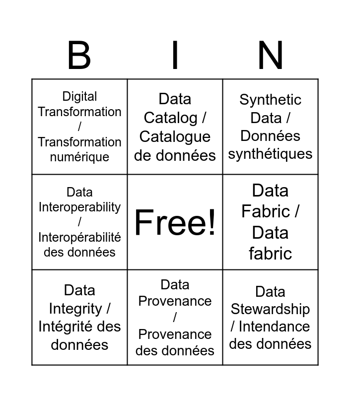 This bingo card has a free space and 49 words: Access to Information (ATI) / Accès à l’information (AI), Artificial Intelligence (AI) / Intelligence artificielle (IA), Application Programming Interface (API) / Interface de programmation d'applications (API), Auditing / Audit, Bias (in AI) / Biais (dans l’IA), Information Asset / Actif informationnel, Data Catalog / Catalogue de données, Data Ethics / Éthique des données, Data Fabric / Data fabric, Data Governance / Gouvernance des données, Data Integrity / Intégrité des données, Data Interoperability / Interopérabilité des données, Data Lake / Lac de données, Data Literacy / Littératie des données, Data Mesh / Maillage de données, Data Pipeline / Pipeline de données, Data Provenance / Provenance des données, Data Quality / Qualité des données, Data Sovereignty / Souveraineté des données, Data Stewardship / Intendance des données, Deduplication / Déduplication, Digital Fitness / Aptitude numérique, Digital Transformation / Transformation numérique, Disposition / Disposition, Enterprise Information Architecture (EIA) / Architecture de l'information d'entreprise (AIE), Explainable AI (XAI) / IA explicable (XAI), Human-in-the-Loop / Boucle humaine, Information Management (IM) / Gestion de l'information (GI), IM Policy / Politique GI, Information Management Officer (IMO) / Officier de la gestion de l'information (OGI), Large Language Model (LLM) / Grand modèle de langage (LLM), Metadata / Métadonnées, Machine Learning (ML) / Apprentissage automatique (AA), Natural Language Processing (NLP) / Traitement automatique du langage naturel (TALN), Ontology / Ontologie, Privacy Protection / Protection de la vie privée, Prompt Engineering / Ingénierie de requête, Retrieval-Augmented Generation (RAG) / Génération augmentée par récupération (RAG), Role-Based Access Control (RBAC) / Contrôle d’accès basé sur les rôles (RBAC), Records Management / Gestion des documents, Retention Schedule / Calendrier de conservation, Redundant, Outdated, Trivial (ROT) / Redondant, Obsolète, Trivial (ROT), Sensitivity Label / Étiquette de sensibilité, Simple Knowledge Organization System (SKOS) / Système simple d’organisation des connaissances (SKOS), Stewardship / Intendance, Synthetic Data / Données synthétiques, Taxonomy / Taxonomie, Transitory Data / Données transitoires and Zero Trust / Zéro confiance.