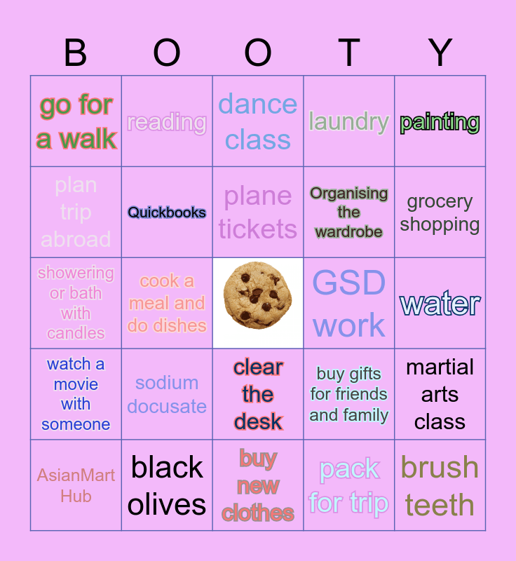This bingo card has a free space and 24 words: sodium docusate, black olives, plane tickets, AsianMart Hub, painting, go for a walk, plan trip abroad, reading, GSD work, clear the desk, Organising the wardrobe, showering or bath with candles, buy gifts for friends and family, martial arts class, Quickbooks, pack for trip, water, dance class, grocery shopping, cook a meal and do dishes, brush teeth, watch a movie with someone, laundry and buy new clothes.