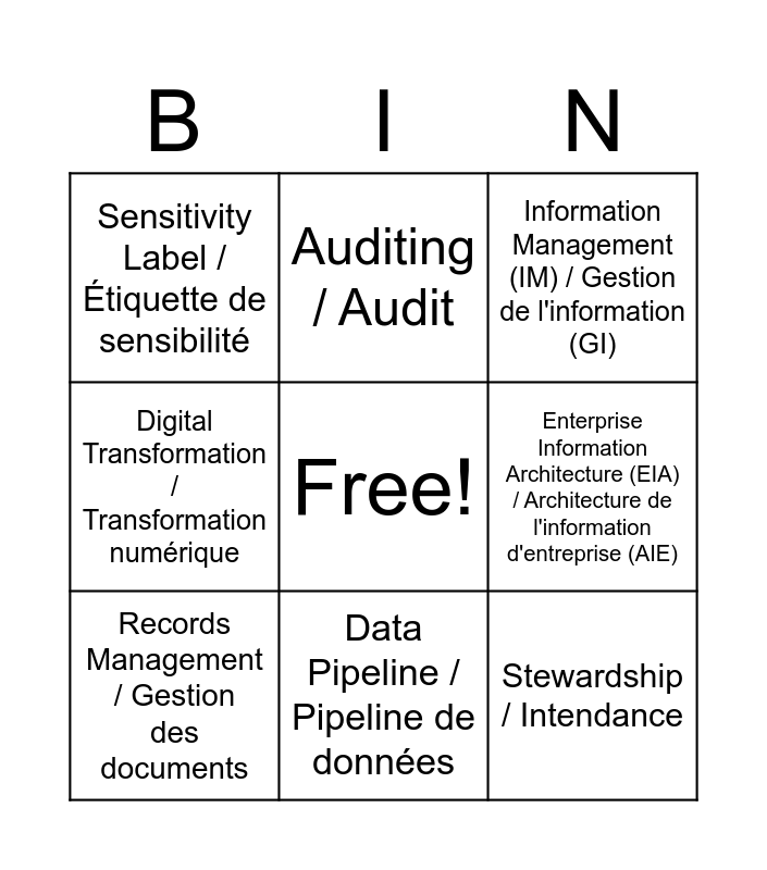 This bingo card has a free space and 49 words: Data Catalog / Catalogue de données, Artificial Intelligence (AI) / Intelligence artificielle (IA), Information Management Officer (IMO) / Officier de la gestion de l'information (OGI), Data Fabric / Data fabric, Data Interoperability / Interopérabilité des données, Deduplication / Déduplication, Auditing / Audit, IM Policy / Politique GI, Enterprise Information Architecture (EIA) / Architecture de l'information d'entreprise (AIE), Natural Language Processing (NLP) / Traitement automatique du langage naturel (TALN), Records Management / Gestion des documents, Digital Transformation / Transformation numérique, Human-in-the-Loop / Boucle humaine, Role-Based Access Control (RBAC) / Contrôle d’accès basé sur les rôles (RBAC), Ontology / Ontologie, Data Quality / Qualité des données, Data Pipeline / Pipeline de données, Metadata / Métadonnées, Retrieval-Augmented Generation (RAG) / Génération augmentée par récupération (RAG), Stewardship / Intendance, Privacy Protection / Protection de la vie privée, Digital Fitness / Aptitude numérique, Sensitivity Label / Étiquette de sensibilité, Redundant, Outdated, Trivial (ROT) / Redondant, Obsolète, Trivial (ROT), Data Lake / Lac de données, Access to Information (ATI) / Accès à l’information (AI), Prompt Engineering / Ingénierie de requête, Disposition / Disposition, Data Ethics / Éthique des données, Data Governance / Gouvernance des données, Data Literacy / Littératie des données, Synthetic Data / Données synthétiques, Large Language Model (LLM) / Grand modèle de langage (LLM), Data Provenance / Provenance des données, Information Asset / Actif informationnel, Bias (in AI) / Biais (dans l’IA), Data Mesh / Maillage de données, Data Sovereignty / Souveraineté des données, Transitory Data / Données transitoires, Simple Knowledge Organization System (SKOS) / Système simple d’organisation des connaissances (SKOS), Application Programming Interface (API) / Interface de programmation d'applications (API), Explainable AI (XAI) / IA explicable (XAI), Retention Schedule / Calendrier de conservation, Zero Trust / Zéro confiance, Taxonomy / Taxonomie, Information Management (IM) / Gestion de l'information (GI), Machine Learning (ML) / Apprentissage automatique (AA), Data Stewardship / Intendance des données and Data Integrity / Intégrité des données.