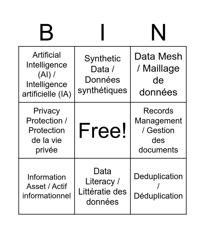 This bingo card has a free space and 49 words: Data Fabric / Data fabric, Retention Schedule / Calendrier de conservation, Retrieval-Augmented Generation (RAG) / Génération augmentée par récupération (RAG), Digital Fitness / Aptitude numérique, Natural Language Processing (NLP) / Traitement automatique du langage naturel (TALN), Data Catalog / Catalogue de données, Synthetic Data / Données synthétiques, Taxonomy / Taxonomie, Records Management / Gestion des documents, Metadata / Métadonnées, Information Asset / Actif informationnel, Privacy Protection / Protection de la vie privée, Explainable AI (XAI) / IA explicable (XAI), Disposition / Disposition, Role-Based Access Control (RBAC) / Contrôle d’accès basé sur les rôles (RBAC), Data Provenance / Provenance des données, Data Literacy / Littératie des données, Stewardship / Intendance, Information Management Officer (IMO) / Officier de la gestion de l'information (OGI), Deduplication / Déduplication, Data Quality / Qualité des données, Digital Transformation / Transformation numérique, Artificial Intelligence (AI) / Intelligence artificielle (IA), Data Interoperability / Interopérabilité des données, Machine Learning (ML) / Apprentissage automatique (AA), Information Management (IM) / Gestion de l'information (GI), Access to Information (ATI) / Accès à l’information (AI), Data Stewardship / Intendance des données, Data Ethics / Éthique des données, Auditing / Audit, IM Policy / Politique GI, Sensitivity Label / Étiquette de sensibilité, Data Integrity / Intégrité des données, Application Programming Interface (API) / Interface de programmation d'applications (API), Data Lake / Lac de données, Data Governance / Gouvernance des données, Redundant, Outdated, Trivial (ROT) / Redondant, Obsolète, Trivial (ROT), Large Language Model (LLM) / Grand modèle de langage (LLM), Transitory Data / Données transitoires, Data Sovereignty / Souveraineté des données, Ontology / Ontologie, Data Pipeline / Pipeline de données, Simple Knowledge Organization System (SKOS) / Système simple d’organisation des connaissances (SKOS), Enterprise Information Architecture (EIA) / Architecture de l'information d'entreprise (AIE), Human-in-the-Loop / Boucle humaine, Data Mesh / Maillage de données, Bias (in AI) / Biais (dans l’IA), Prompt Engineering / Ingénierie de requête and Zero Trust / Zéro confiance.