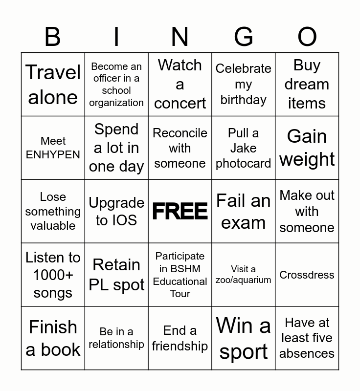 This bingo card has a free space and 24 words: Retain PL spot, Be in a relationship, Reconcile with someone, Finish a book, Buy dream items, Travel alone, Meet ENHYPEN, Become an officer in a school organization, Fail an exam, Participate in BSHM Educational Tour, Pull a Jake photocard, Lose something valuable, Visit a zoo/aquarium, Crossdress, Spend a lot in one day, Win a sport, Make out with someone, Watch a concert, Gain weight, Upgrade to IOS, Have at least five absences, Listen to 1000+ songs, Celebrate my birthday and End a friendship.