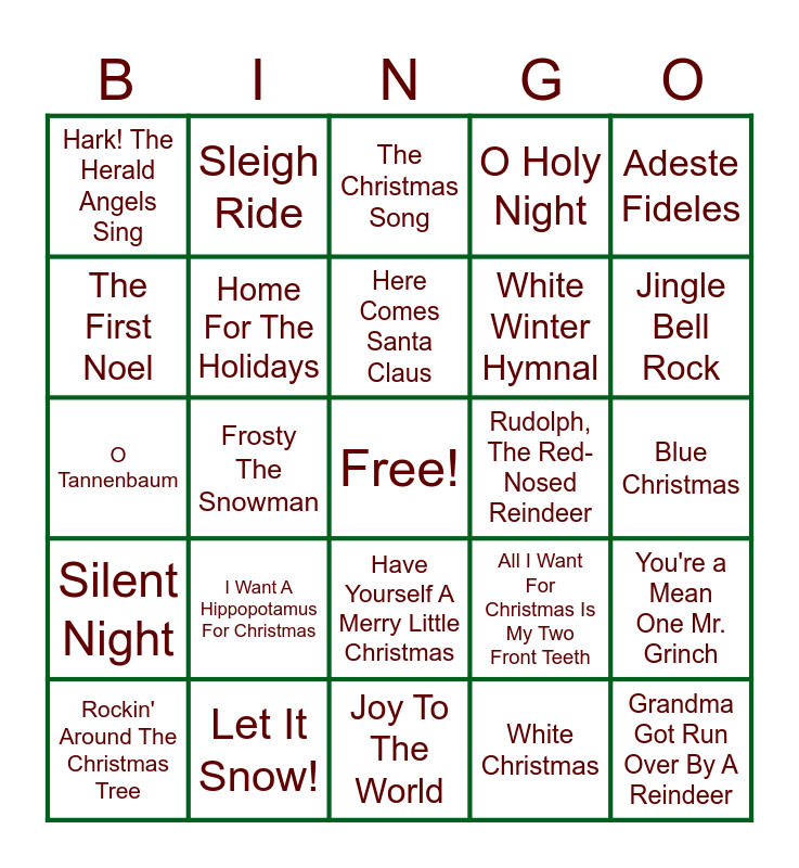This bingo card has a free space and 28 words: You're a Mean One Mr. Grinch, Winter Wonderland, White Winter Hymnal, White Christmas, The First Noel, The Christmas Song, Sleigh Ride, Silent Night, Rudolph, The Red-Nosed Reindeer, Rockin' Around The Christmas Tree, O Tannenbaum, O Holy Night, Let It Snow!, Joy To The World, Jingle Bell Rock, It's The Most Wonderful Time Of The Year, I Want A Hippopotamus For Christmas, Home For The Holidays, Here Comes Santa Claus, Have Yourself A Merry Little Christmas, Hark! The Herald Angels Sing, Hallelujah Chorus, Grandma Got Run Over By A Reindeer, Frosty The Snowman, Blue Christmas, All I Want For Christmas Is My Two Front Teeth, Adeste Fideles and A Holly Jolly Christmas.