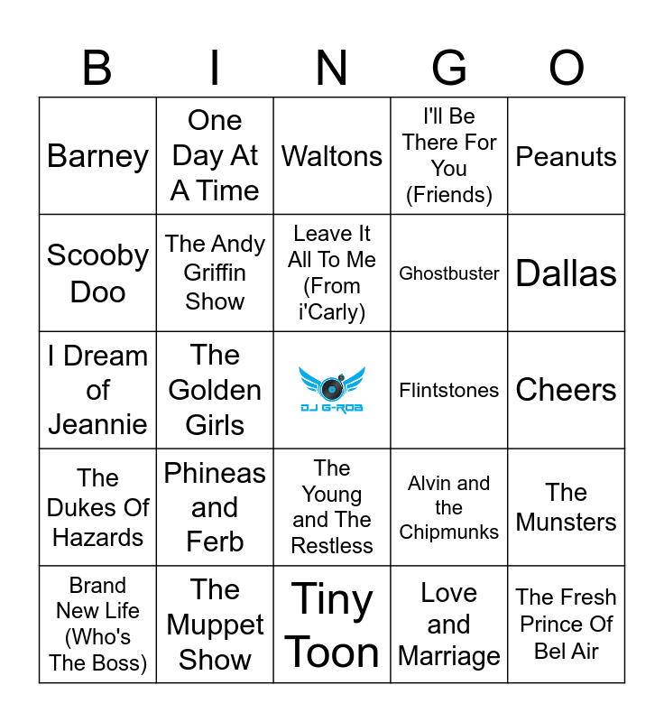 This bingo card has a free space and 39 words: Love Boat, Movin' On Up (The Jefferson's), Happy Days, The Andy Griffin Show, Brand New Life (Who's The Boss), The Young and The Restless, Leave It All To Me (From i'Carly), Barnie Miller, Peanuts, The Dukes Of Hazards, The Golden Girls, I'll Be There For You (Friends), The Fresh Prince Of Bel Air, Cheers, Flintstones, Phineas and Ferb, Spongebob, Barney, Looney Tunes, Alvin and the Chipmunks, Scooby Doo, Tiny Toon, Ghostbuster, Dallas, Good Times, All In The Family, Brady Bunch, Sanford and Son, M.A.S.H., One Day At A Time, Three's Company, The Adams Family, Waltons, The Muppet Show, Love and Marriage, Bewitched, The Munsters, I Dream of Jeannie and The Monkees.