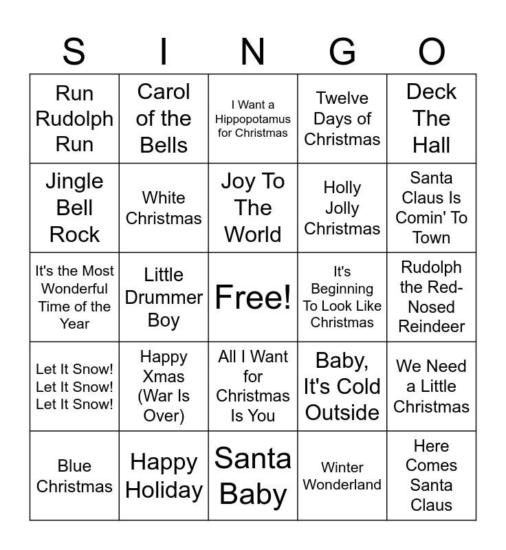 This bingo card has a free space and 29 words: Blue Christmas, Have Yourself A Merry Little Christmas, Little Drummer Boy, Jingle Bells, Run Rudolph Run, I Want a Hippopotamus for Christmas, White Christmas, Happy Xmas (War Is Over), It's Beginning To Look Like Christmas, Happy Holiday, Rudolph the Red-Nosed Reindeer, Here Comes Santa Claus, Santa Baby, Winter Wonderland, Santa Claus Is Comin' To Town, Frosty the Snowman, All I Want for Christmas Is You, Let It Snow! Let It Snow! Let It Snow!, Deck The Hall, It's the Most Wonderful Time of the Year, Baby, It's Cold Outside, Feliz Navidad, Holly Jolly Christmas, Jingle Bell Rock, Twelve Days of Christmas, Carol of the Bells, We Need a Little Christmas, Joy To The World and Rockin' Around The Christmas Tree.