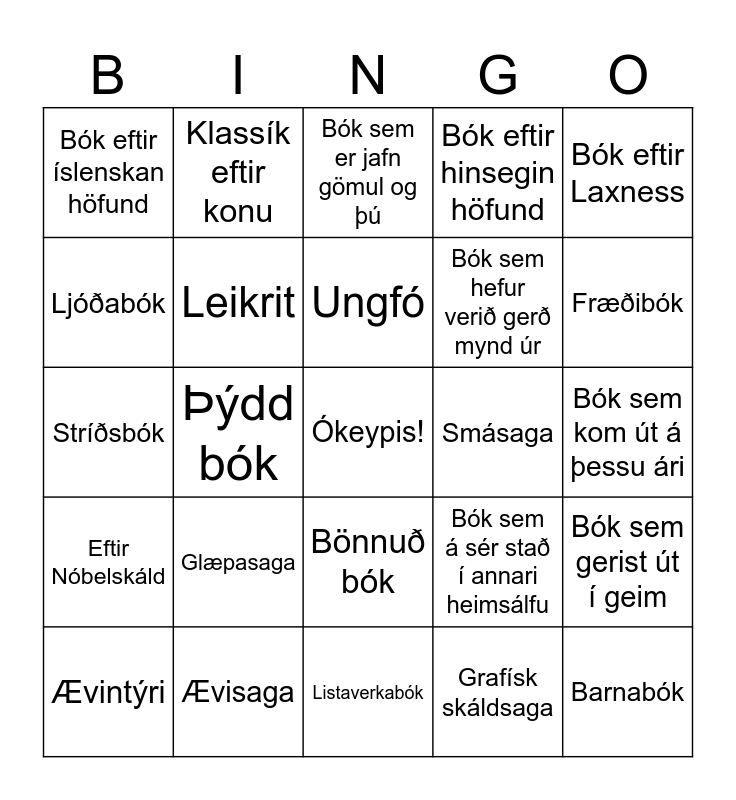 This bingo card has a free space and 24 words: Glæpasaga, Ævisaga, Ungfó, Ævintýri, Bók eftir Laxness, Bók eftir íslenskan höfund, Ljóðabók, Klassík eftir konu, Smásaga, Bönnuð bók, Bók sem hefur verið gerð mynd úr, Stríðsbók, Bók sem á sér stað í annari heimsálfu, Bók sem gerist út í geim, Leikrit, Grafísk skáldsaga, Bók sem kom út á þessu ári, Bók sem er jafn gömul og þú, Fræðibók, Þýdd bók, Barnabók, Eftir Nóbelskáld, Bók eftir hinsegin höfund and Listaverkabók.