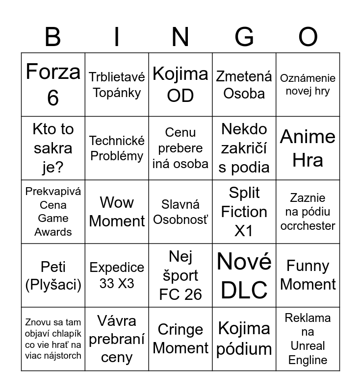This bingo card has a free space and 24 words: Expedice 33 X3, Vávra prebraní ceny, Cenu prebere iná osoba, Znovu sa tam objaví chlapík co vie hrať na viac nájstorch, Oznámenie novej hry, Forza 6, Kto to sakra je?, Trblietavé Topánky, Split Fiction X1, Nej šport FC 26, Nekdo zakričí s podia, Prekvapivá Cena Game Awards, Nové DLC, Funny Moment, Technické Problémy, Kojima pódium, Zaznie na pódiu ocrchester, Kojima OD, Anime Hra, Wow Moment, Reklama na Unreal Engline, Peti (Plyšaci), Zmetená Osoba and Cringe Moment.