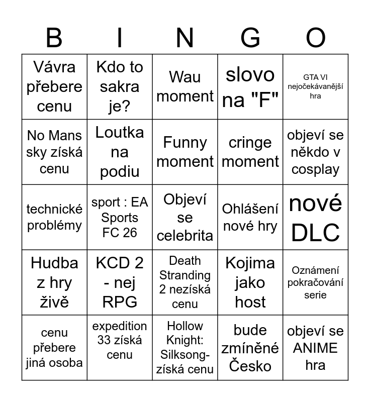 This bingo card has a free space and 24 words: KCD 2 - nej RPG, expedition 33 získá cenu, Funny moment, cenu přebere jiná osoba, GTA VI nejočekávanější hra, Vávra přebere cenu, No Mans sky získá cenu, Kdo to sakra je?, Ohlášení nové hry, Death Stranding 2 nezíská cenu, cringe moment, technické problémy, Kojima jako host, Oznámení pokračování serie, Loutka na podiu, bude zmíněné Česko, nové DLC, Wau moment, objeví se někdo v cosplay, sport : EA Sports FC 26, objeví se ANIME hra, Hudba z hry živě, slovo na "F" and Hollow Knight: Silksong- získá cenu.