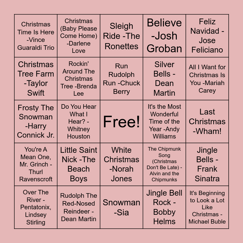 This bingo card has a free space and 34 words: What Christmas Means to Me -John Legend and Stevie Wonder, Jingle Bell Rock -Bobby Helms, Blue Christmas -Elvis Presley, Wonderful Christmastime -Paul McCartney, You're A Mean One, Mr. Grinch -Thurl Ravenscroft, Rockin' Around The Christmas Tree -Brenda Lee, Feliz Navidad -Jose Feliciano, Over The River -Pentatonix, Lindsey Stirling, Christmas (Baby Please Come Home) -Darlene Love, Holly Jolly Christmas -Michael Buble, Run Rudolph Run -Chuck Berry, Sleigh Ride -The Ronettes, Underneath the Tree -Kelly Clarkson, Let It Snow! Let It Snow! Let It Snow! -Dean Martin, It's the Most Wonderful Time of the Year -Andy Williams, All I Want for Christmas Is You -Mariah Carey, Rudolph The Red-Nosed Reindeer -Dean Martin, Frosty The Snowman -Harry Connick Jr., Little Saint Nick -The Beach Boys, The Chipmunk Song (Christmas Don't Be Late) -Alvin and the Chipmunks, White Christmas -Norah Jones, Man With The Bag -Jessie J, Christmas Time Is Here -Vince Guaraldi Trio, Last Christmas -Wham!, Snowman -Sia, It's Beginning to Look a Lot Like Christmas -Michael Buble, Believe -Josh Groban, Santa Claus is Coming to Town -Michael Buble, Silver Bells -Dean Martin, Christmas Tree Farm -Taylor Swift, Santa, Can't You Hear Me? -Kelly Clarkson, Ariana Grande, Do You Hear What I Hear? -Whitney Houston, Jingle Bells -Frank Sinatra and Mary, Did You Know? -Pentatonix.