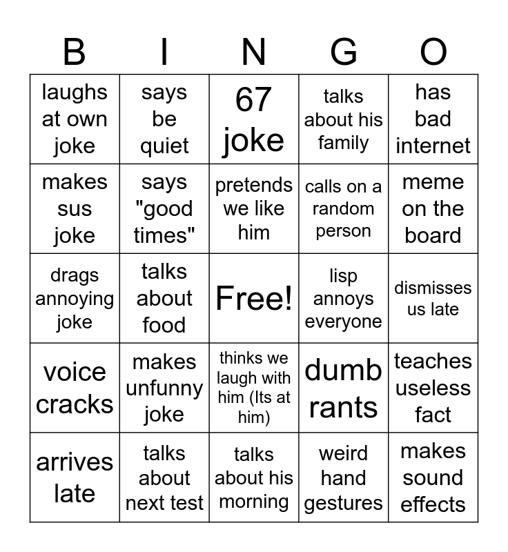 This bingo card has a free space and 24 words: makes unfunny joke, talks about next test, pretends we like him, arrives late, has bad internet, laughs at own joke, makes sus joke, says be quiet, lisp annoys everyone, thinks we laugh with him (Its at him), calls on a random person, drags annoying joke, dumb rants, teaches useless fact, says "good times", weird hand gestures, dismisses us late, 67 joke, meme on the board, talks about food, makes sound effects, voice cracks, talks about his family and talks about his morning.